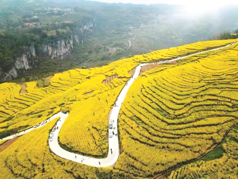 楚天都市报极目新闻讯(记者陈俊 通讯员吴洁)早春二月,恩施大峡谷的朝东岩下生机勃勃,漫山遍野的油菜花冒出花骨朵。2月26日至28日,恩施市屯堡乡田凤坪村的数千村民喜洋洋领取树苗,在花海边、院落旁培土种树。这个曾经条件艰苦靠绝壁取水的村庄,如今发展油菜赏花游,春天里的油菜花海已成网红打卡地。
