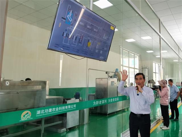 图为:中国农科院油料作物研究所所长黄凤洪研究员在企业生产车间介绍该技术