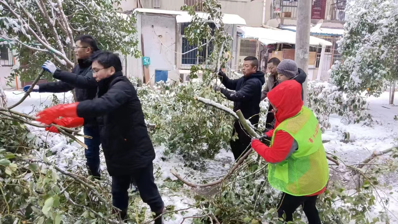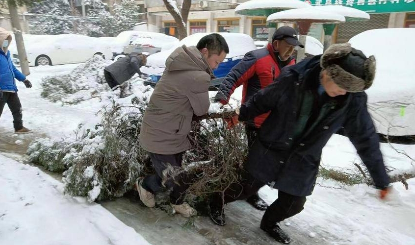 伴随着淅沥作响的大雪,突击队员们在居民区内迅速行动着,有的拖拽残枝断木、有的清扫积雪、有的拿着锯条锯开缠绕的树枝,还有的一边铺设草垫,全力帮助居民们铲雪清障。