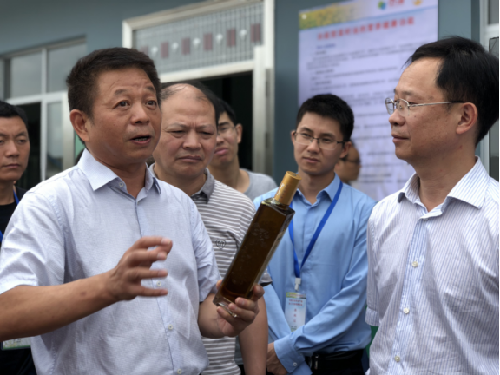 图为中国农科院副院长、中国工程院院士王汉中(左)在菜籽油产地加工技术现场观摩会上了解产地加工菜籽油的品质。
