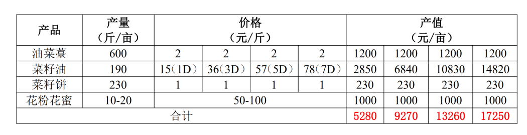 位于监利县程集镇的油菜“万元田”模式示范区示范面积达到了2万亩。专家组对湖北监利示范区种植的油菜新品种中油杂19进行的测产验收显示,中油杂19理论亩产达228.06公斤,每亩可生产优质油菜薹300公斤,产值1200元;按照3D、5D、7D工艺标准生产优质菜籽油95公斤,产值分别为6840、10830和14820元;生产菜籽饼115公斤,产值230元;生产花粉花蜜5-10公斤,产值约1000元。