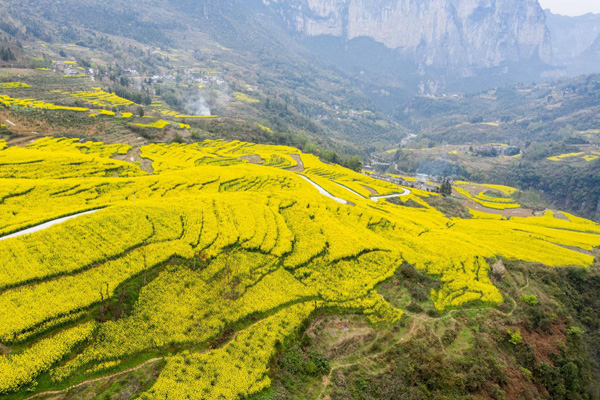 今年3月底千亩油菜花进入盛花期,金黄色的花海随梯田层层绵延,如涛似浪,蔚为壮观,通过拍摄风景宣传片,开展新媒体推介,千亩油菜花海成为恩施户外的新晋网红拍照打卡景点。在长达20多天的花期里,每日吸引恩施、利川等市民2000多人次前来观光。仅靠销售油菜花蜜、土鸡蛋等土特产,村民一天收入就超过1000元。