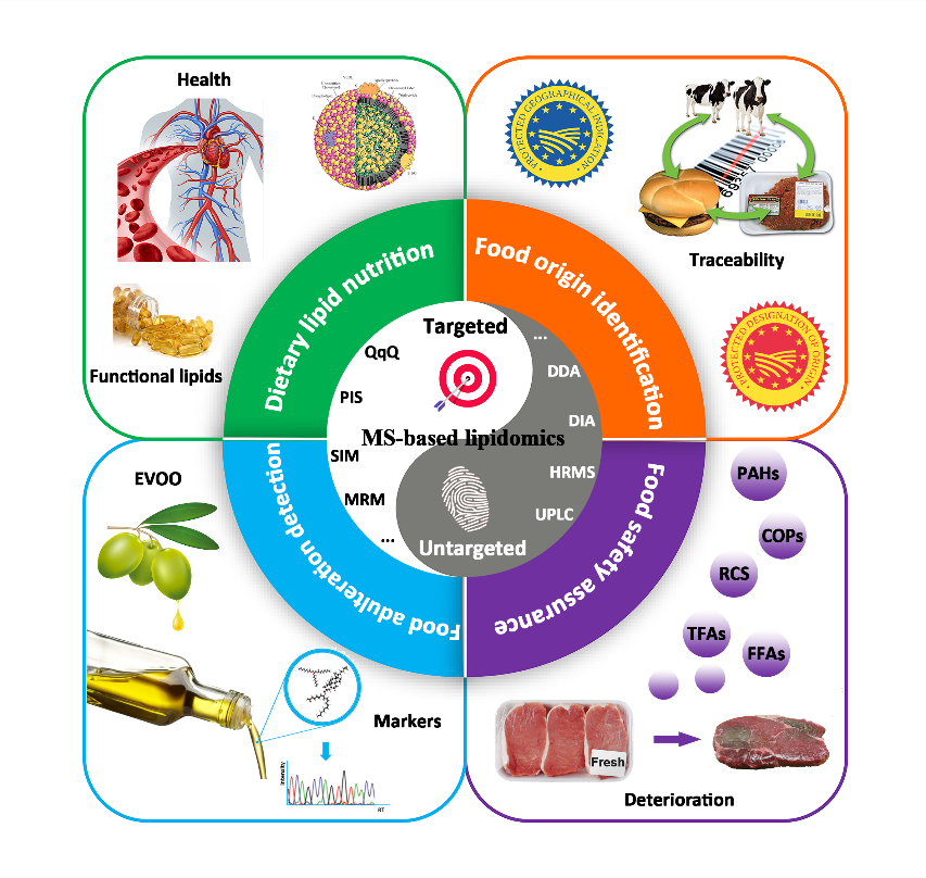 脂质是人体所需三大营养素之一,广泛存在于农产品生物资源或作为原料添加到各种加工食品中。脂质及其反应产物对食品体系的消费、营养品质特性和机体的正常生理功能有着重要影响。基于质谱的脂质组学技术和方法已经广泛应用于研究食品特性(例如味道,质地,风味和颜色)的分子基础、识别食品欺诈行为、监控食品安全风险和特定饮食方式或膳食干预措施对人类健康和疾病的影响,从而为食品安全和质量管理、个性化健康与营养以及精准饮食干预措施等提供依据。